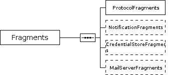 The branch element for reusable transfer configuration. Subsequent fragments are used e.g. for file transfer specifications, notifications, mail server settings, that can be used in a number of file transfer Profiles. A fragment specifies how a file transfer is carried out whereas a Profile specifies what should be transferred. Therefore multiple profiles can use the same fragments, e.g. to transfer different files from the same source or to reuse the same transfer specification as the source and the target in different transfer operations. Fragments are a means to organize file transfer settings in a reusable way: Any number of fragments can be configured. They are distinguished by their name attribute. References to a fragment use the value of the name attribute to identify the respective fragment. Notification fragments are used to specifiy how notifications will be sent to recipients in case of file transfers. Fragments for credential stores are a means to organize secure settings in a reusable way: Any number of fragments can be configured. They are distinguished by their name attribute. References to a fragment use the value of the name attribute to identify the respective fragment. Mail server fragments are used to specifiy by what mail server notifications will be sent to recipients in case of file transfers.