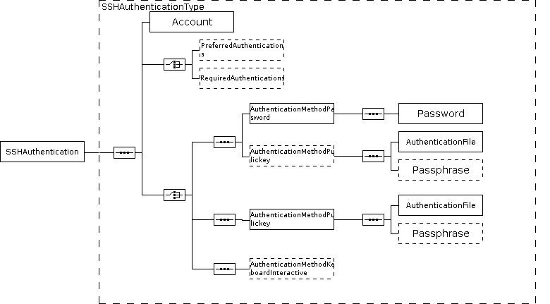 The SSHAuthentication element specifies the credentials for authentication with a server, e.g. an FTP Server or a Proxy. Child elements include: Account for authentication at one of the systems involved in file transfer, e.g. an FTP or SFTP server. Usually the account corresponds to a user name. Should the respective server system be part of a Windows domain then the syntax domain\account can be used. Support for KeePass versions 1 and 2. Note: Availability starting with YADE-464. Referencing CredentialStore fields. Note: Availability starting with YADE-481. Referencing a field in the CredentialStore is effected by the following syntax: cs://[entry_path]@entry_field where <Hostname> element: Examples Specifies the order in which the client should try protocol 2 authentication methods. This allows a client to prefer one method (e.g. publickey) over another method (e.g. password). Specifies the authentication methods that must be successfully completed for a user to be granted access. See SSH configuration: The use of this element specifies that for SSHAuthentication an authentication method using a Password will be applied. As an alternative to using passwords the authentication methods: Password for authentication at a server that is involved in file transfer, e.g. with an FTP or SFTP protocol or Proxy protocol that makes use of BasicAuthentication. Passwords are not displayed in the YADE log files. A drawback is that passwords are visible in YADE configuration files. In order to avoid this you could switch to using File Transfer Protocols that allow SSHAuthentication, e.g. SFTP. Support for KeePass versions 1 and 2. Note: Availability starting with YADE-464. Referencing CredentialStore fields. Note: Availability starting with YADE-481. Referencing a field in the CredentialStore is effected by the following syntax: cs://[entry_path]@entry_field where <Hostname> element: Examples The use of this element specifies that for SSHAuthentication an authentication method for public/private keys using an AuthenticationFile will be applied. This is called public/private key authentication and helps to avoid the use of passwords for authentication. As an alternative to public/private key authentication the authentication methods: The value of this parameter specifies the path and name of an account's private key file used for SSHAuthentication. This parameter must be specified if the authentication method AuthenticationMethodPublickey is used. Should the private key file be secured by a passphrase then this must be specified using the Passphrase parameter. Authentication files are most often stored in the user home directory in a .ssh folder and have to be secured with the proper file permissions. However, any path can be specified for an authentication file with this parameter. The location of the authentication file has to be accessbible for the account that runs the YADE Client. For Unix systems file permissions 600 are required for authentication files. Support for KeePass versions 1 and 2. Note: Availability starting with YADE-464. Referencing CredentialStore fields. Note: Availability starting with YADE-481. Referencing a field in the CredentialStore is effected by the following syntax: cs://[entry_path]@entry_field where <Hostname> element: Examples A passphrase secures an AuthenticationFile that is used for SSHAuthentication. The passphrase is added when creating the private key authentication file. Passphrases are not displayed in the YADE log files. As a drawback passphrases are visible in YADE configuration files if not protected as secure strings, e.g. from a CredentialStore. Support for KeePass versions 1 and 2. Note: Availability starting with YADE-464. Referencing CredentialStore fields. Note: Availability starting with YADE-481. Referencing a field in the CredentialStore is effected by the following syntax: cs://[entry_path]@entry_field where <Hostname> element: Examples The use of this element specifies that for SSHAuthentication an authentication method for public/private keys using an AuthenticationFile will be applied. This is called public/private key authentication and helps to avoid the use of passwords for authentication. As an alternative to public/private key authentication the authentication methods: The value of this parameter specifies the path and name of an account's private key file used for SSHAuthentication. This parameter must be specified if the authentication method AuthenticationMethodPublickey is used. Should the private key file be secured by a passphrase then this must be specified using the Passphrase parameter. Authentication files are most often stored in the user home directory in a .ssh folder and have to be secured with the proper file permissions. However, any path can be specified for an authentication file with this parameter. The location of the authentication file has to be accessbible for the account that runs the YADE Client. For Unix systems file permissions 600 are required for authentication files. Support for KeePass versions 1 and 2. Note: Availability starting with YADE-464. Referencing CredentialStore fields. Note: Availability starting with YADE-481. Referencing a field in the CredentialStore is effected by the following syntax: cs://[entry_path]@entry_field where <Hostname> element: Examples A passphrase secures an AuthenticationFile that is used for SSHAuthentication. The passphrase is added when creating the private key authentication file. Passphrases are not displayed in the YADE log files. As a drawback passphrases are visible in YADE configuration files if not protected as secure strings, e.g. from a CredentialStore. Support for KeePass versions 1 and 2. Note: Availability starting with YADE-464. Referencing CredentialStore fields. Note: Availability starting with YADE-481. Referencing a field in the CredentialStore is effected by the following syntax: cs://[entry_path]@entry_field where <Hostname> element: Examples Usage only wit